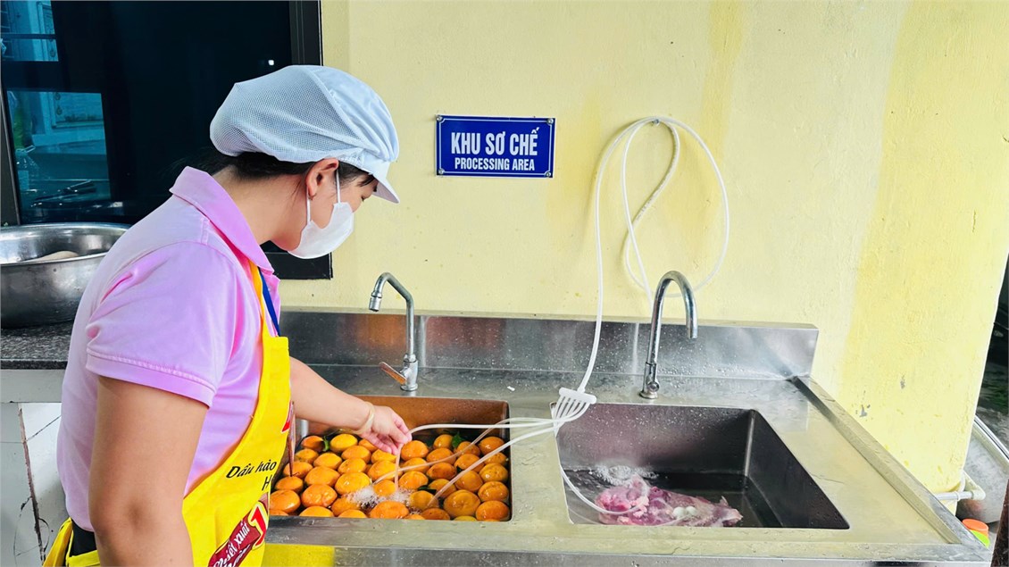 Công tác đảm bảo vệ sinh ATTP luôn được nhà trường đặt lên hàng đầu. Là một trường có tỷ lệ trẻ ăn bán trú 100%. Mỗi ngày trẻ được ăn 2 bữa tại trường, với thực đơn được thay đổi hàng ngày để bảo đảm sự phong phú và đủ chất dinh dưỡng theo yêu cầu. Nhận thức được tầm quan trọng của việc giữ gìn vệ sinh ATTP cho trẻ, nhà trường đã đầu tư vào hệ thống nhà bếp. Đội ngũ nhân viên nhà bếp cũng như giáo viên của trường thường xuyên được tập huấn kiến thức, kỹ năng để đảm bảo vệ sinh ATTP trong các bữa ăn. Nhà trường tăng cường hơn công tác vệ sinh cho trẻ, đặc biệt là đảm bảo vệ sinh ATTP. Không chỉ thực phẩm đảm bảo an toàn, việc chế biến thức ăn, quá trình bảo quản thực phẩm đều phải tuân thủ theo quy trình bếp 1 chiều từ khâu sơ chế, đến khâu chia thức ăn. Nhà trường thường xuyên tổ chức tổng vệ sinh từ khu vực bếp đến phòng học; theo dõi sức khỏe của trẻ, đồng thời trực tiếp tuyên truyền, trao đổi với phụ huynh để cùng giữ vệ sinh, bảo vệ sức khỏe cho trẻ.