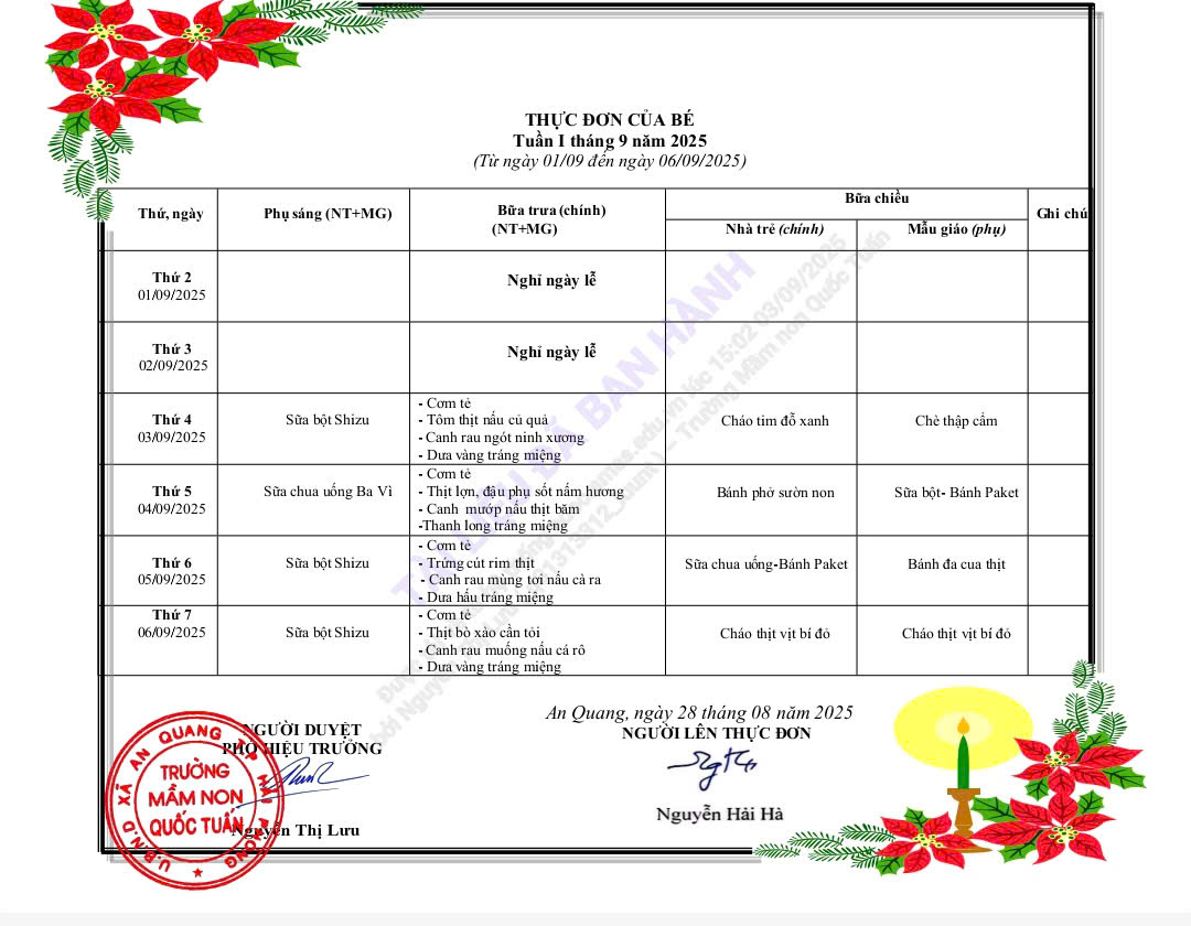 📌 Kính mời quý phụ huynh cùng theo dõi thực đơn chi tiết trong tuần này, để cùng nhà trường đồng hành chăm sóc bé yêu một cách toàn diện – từ bữa ăn đến giấc ngủ, từ tinh thần đến thể chất!