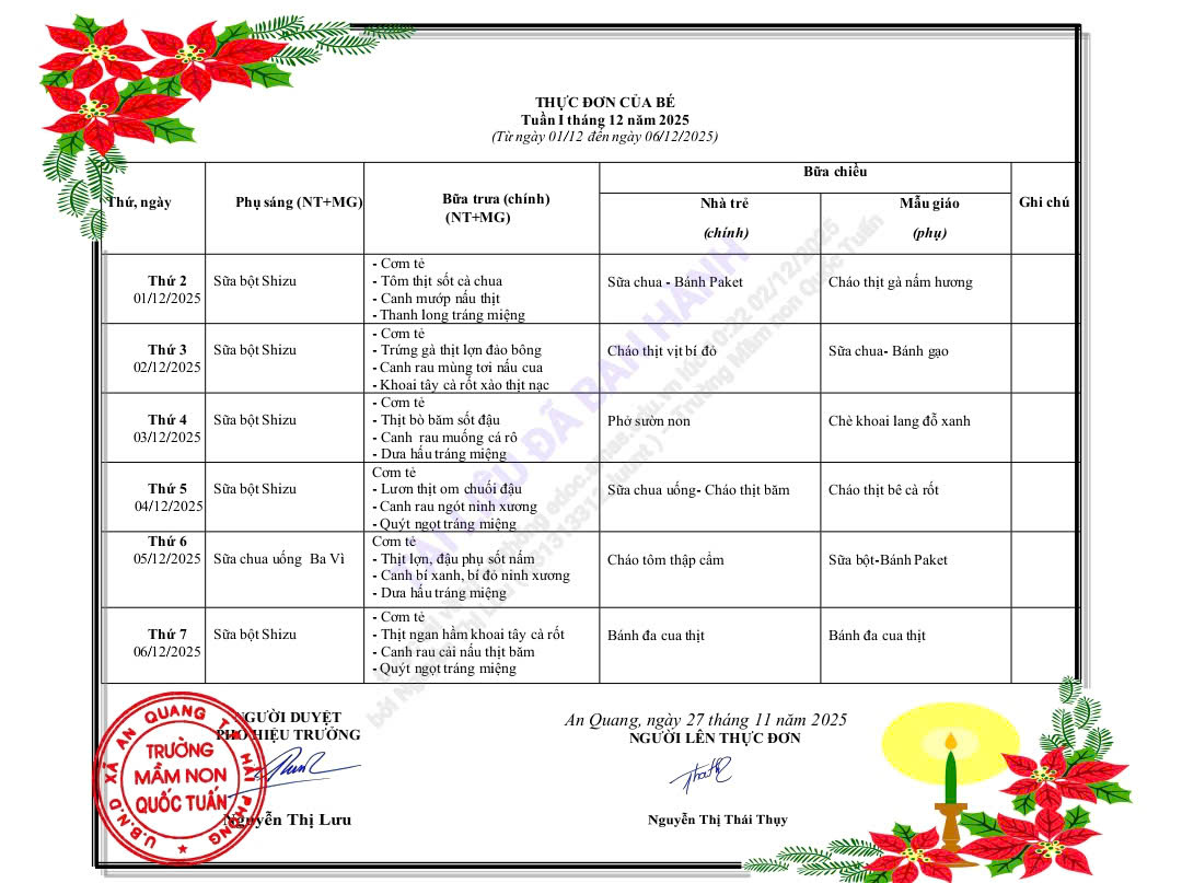 👉 Kính mời quý phụ huynh theo dõi thực đơn chi tiết Tuần 1 – Tháng 12 tại bảng thông báo hoặc hình ảnh đính kèm bên dưới.