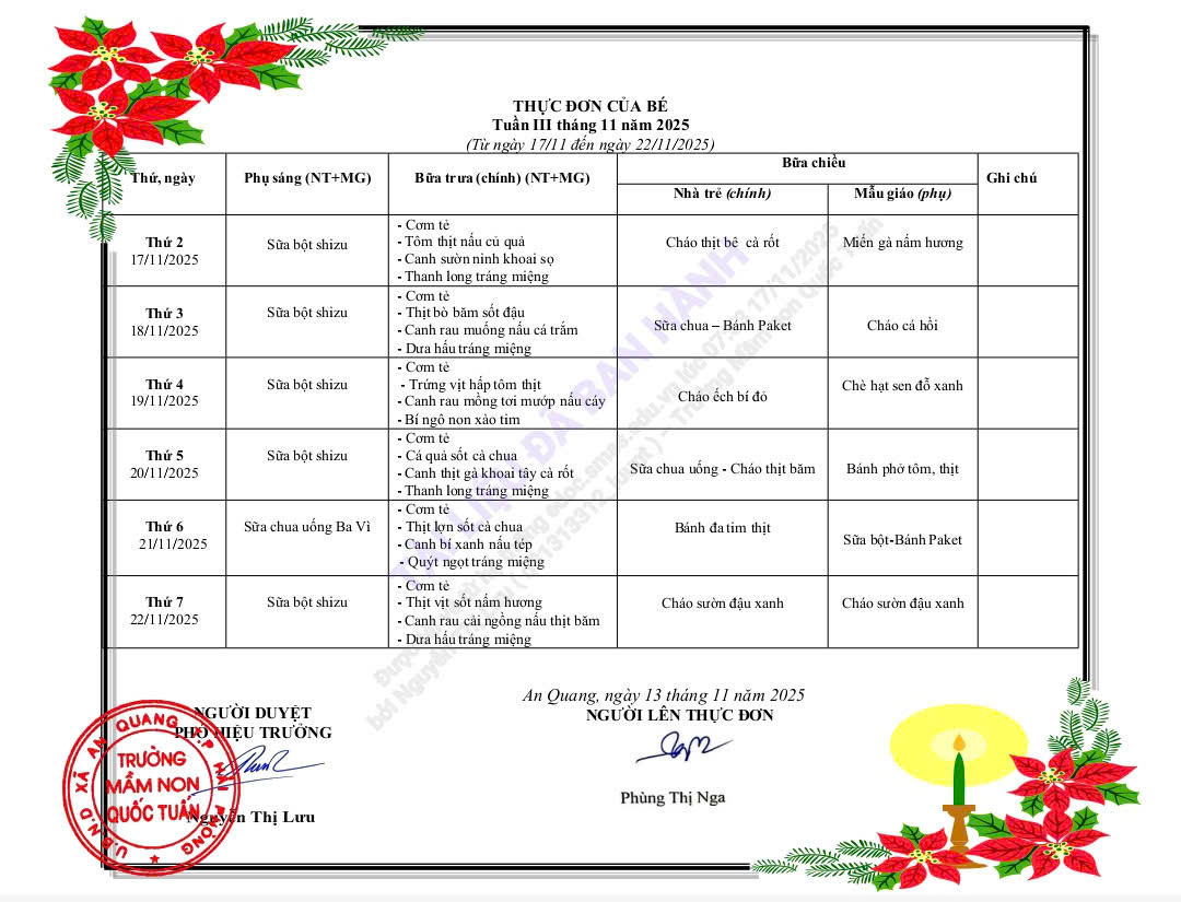 👉 Kính mời quý phụ huynh xem thực đơn chi tiết tuần 3 tháng 11 tại bảng thông báo hoặc hình ảnh đính kèm dưới đây!