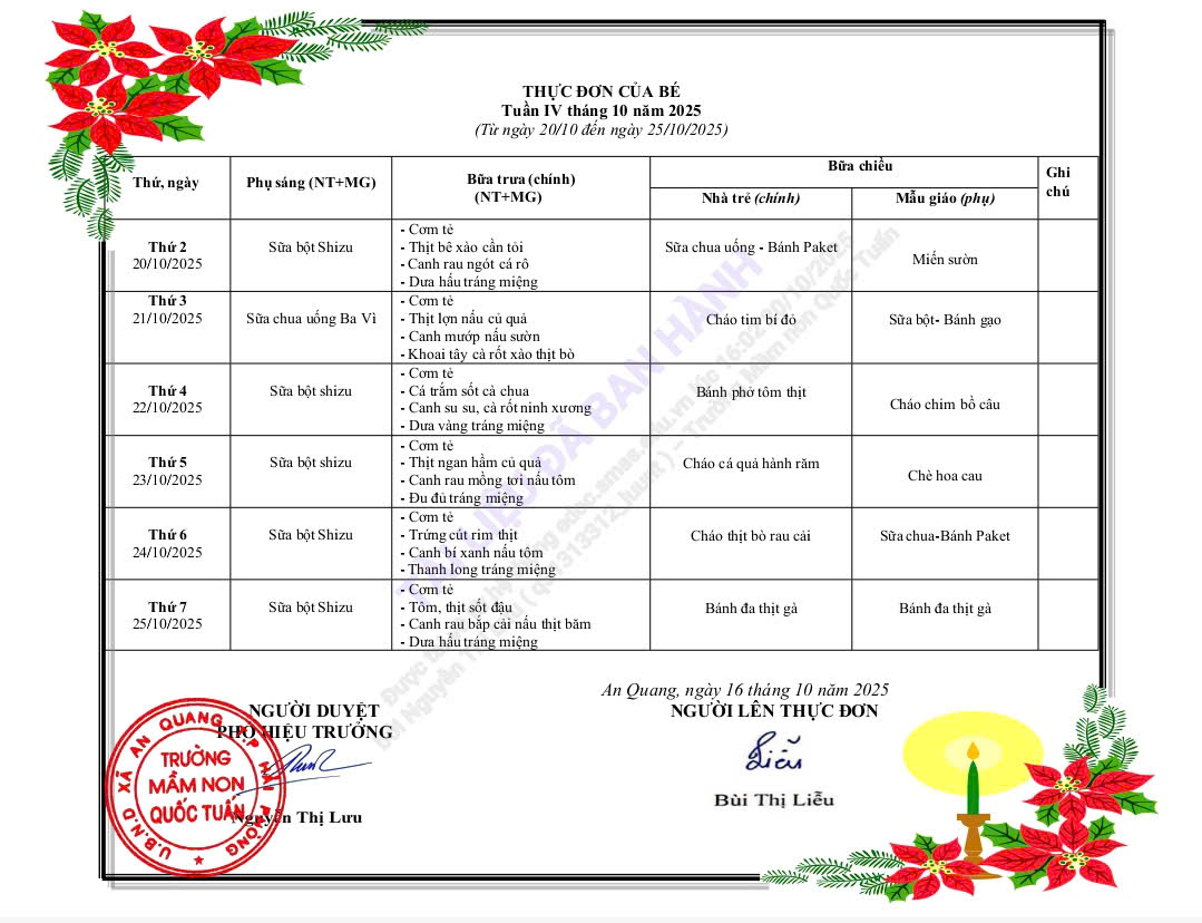 👉 Kính mời bố mẹ cùng tham khảo thực đơn chi tiết tuần 4 tháng 10 tại bảng thông báo/ảnh đính kèm bên dưới!