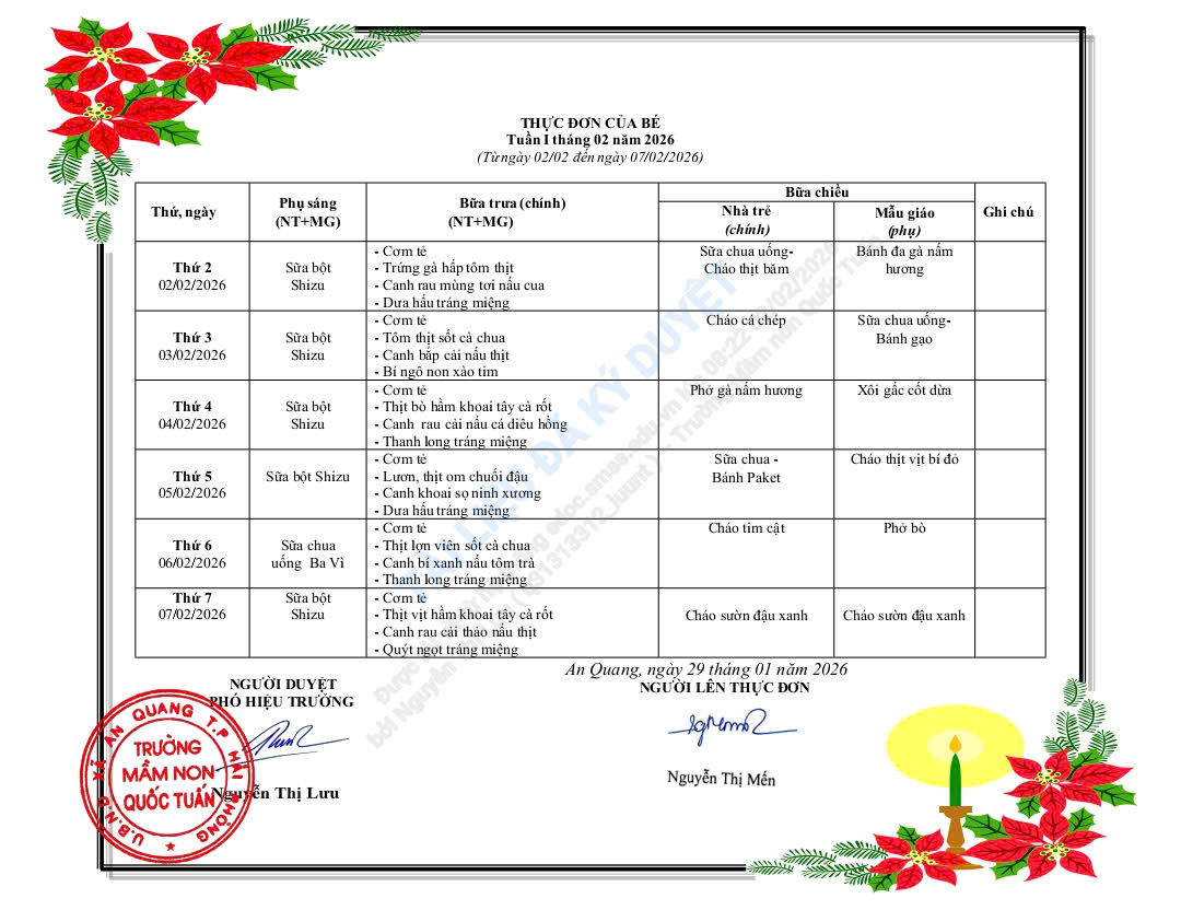 👉 Kính mời quý phụ huynh cùng theo dõi thực đơn chi tiết Tuần I – Tháng 02 năm 2026 tại bảng thông báo hoặc hình ảnh đính kèm.