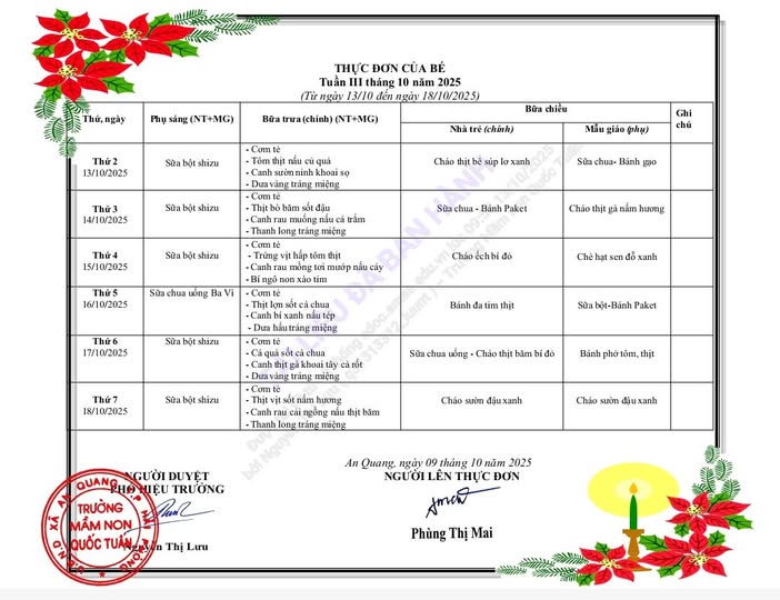 Trường Mầm non Quốc Tuấn luôn chú trọng đến từng bữa ăn của trẻ. Thực đơn tuần III tháng 10/2025 tiếp tục được xây dựng khoa học – an toàn – đủ chất, giúp bé có thêm năng lượng để học tập, vui chơi và phát triển toàn diện.