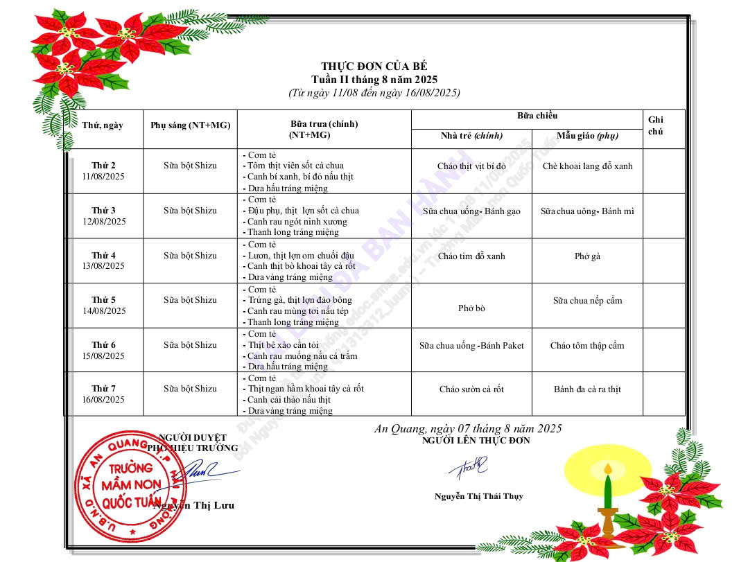 ✨ Thực đơn tuần II – tháng 8/2025 mang đến cho bé yêu: