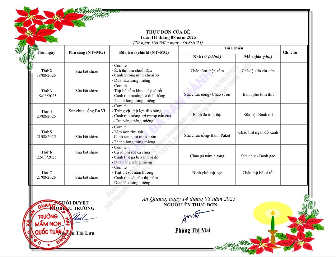 📌 Nhà trường xin gửi tới quý phụ huynh thực đơn chi tiết tuần này để cùng đồng hành chăm sóc và xây dựng chế độ dinh dưỡng hợp lý cho bé tại nhà.