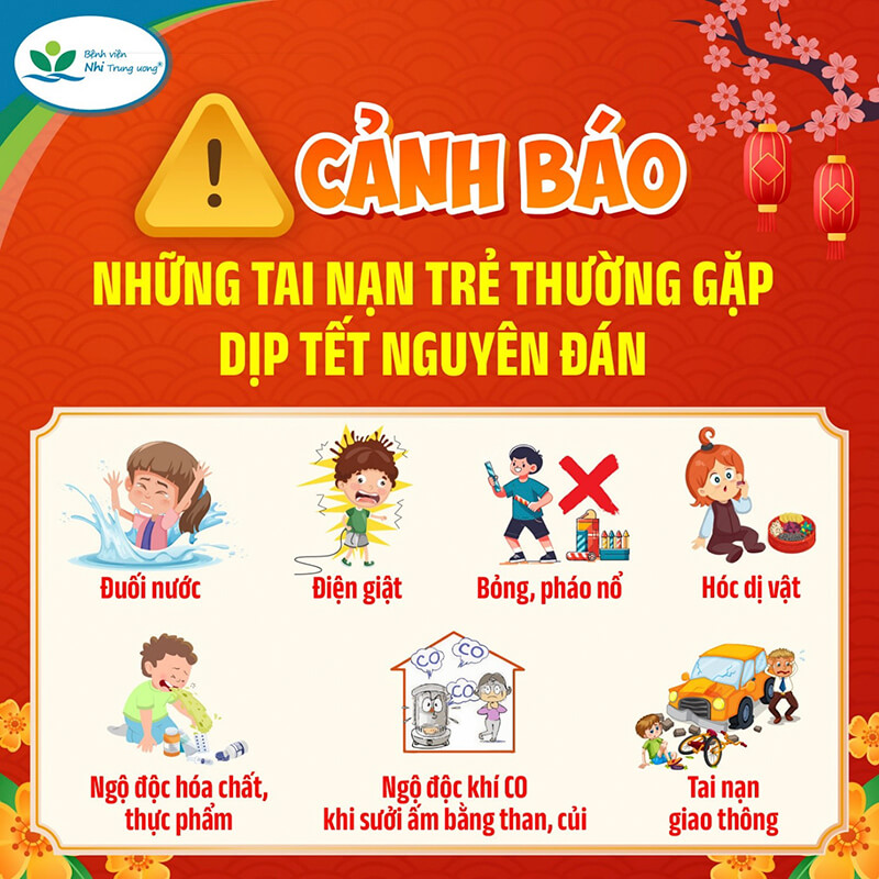 Vì vậy, để những ngày Tết sum vầy được an toàn, trọn vẹn nhất, cha mẹ nên lưu ý đề phòng những tai nạn thường gặp ở trẻ dịp Tết như: đuối nước; điện giật; bỏng, pháo nổ; hóc dị vật; ngộ độc hóa chất, thực phẩm; ngộ độc khí CO do sưởi ấm bằng than; té ngã; tai nạn giao thông,…