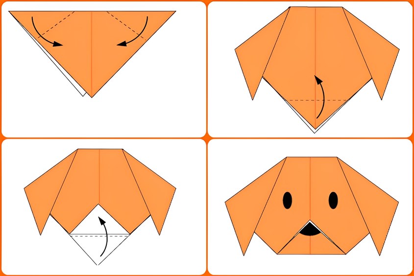 - Bước 2: Gấp đuôi giấy lên tạo hình mặt chó, rồi dùng bút vẽ mắt mũi. Thế là đã hoàn thành chú chó đáng yêu.