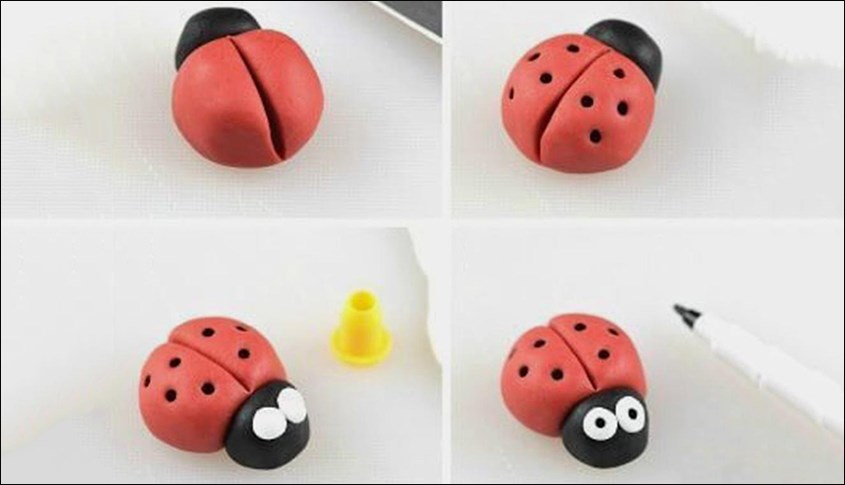 - Bước 1: Lấy phần đất nặn màu đen để tạo hình cái đầu trong cho con bọ, tiếp theo sử dụng đất nặn màu đỏ để tạo phần thân.