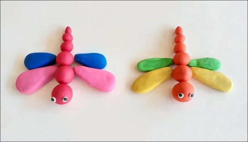 - Bước 3: Tiếp đó, ba mẹ sẽ lấy đất sét màu vàng và đất sét màu xanh để tạo cánh cho chuồn chuồn và gắn vào phần thân.