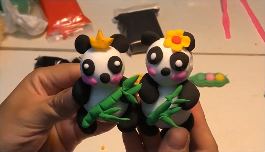 - Bước 5: Cuối cùng lấy đất nặn màu đen để tạo thành hình tròn và kéo dài ra để làm phần tay của gấu trúc, gắn các bộ phận lại với nhau là đã hoàn thành làm con vật bằng đất nặn vô cùng đơn giản rồi.