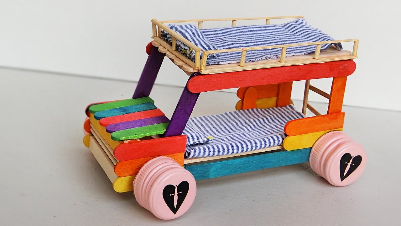 Các bước làm đồ chơi bằng que kem thành xe giường tầng sáng tạo: