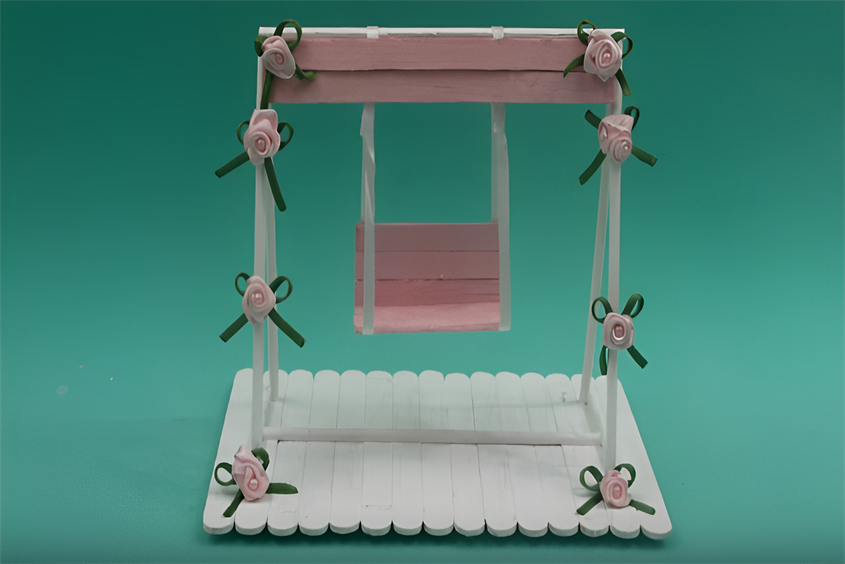 - Bước 12: Trang trí xích đu bằng hoa nhỏ. Vậy là mẹ đã làm đồ chơi bằng que kem thành xích đu xinh xắn cho bé yêu rồi.