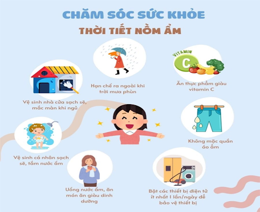 - Vệ sinh thân thể và đồ dùng cá nhân: Quần áo khó khô hẳn khi độ ẩm quá cao nên nếu có thể, hãy dùng máy sấy, bàn là ủi đồ trước khi mặc, tránh các nấm mốc, các bệnh ngoài da.