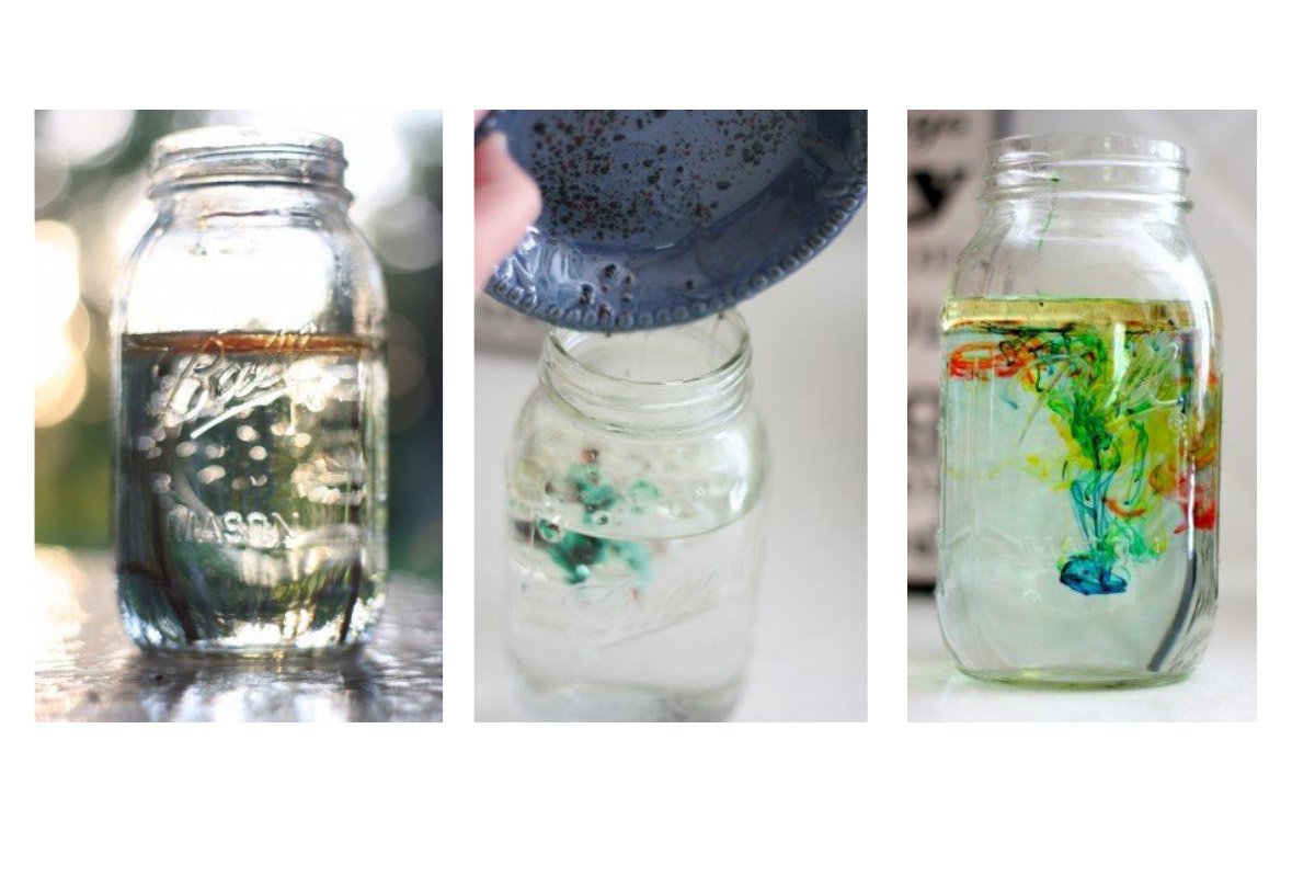 Trước tiên, hãy đổ đầy 3/4 lọ bằng nước ấm. Chuẩn bị một cái chén và trộn 3 – 4 thìa dầu với các giọt màu thực phẩm khác nhau. Sau đó, tiếp tục đổ hỗn hợp dầu trên vào lọ nước.