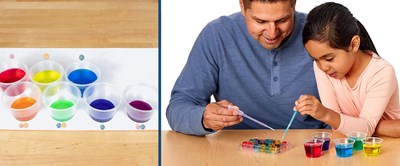 Cách thực hiện: Hoà tan mỗi phẩm màu vào mỗi cốc nước sẽ tạo ra cốc nước màu đỏ, màu vàng, màu xanh. Để có màu tím, cần pha màu xanh dương và màu đỏ. Hay muốn tạo ra màu cam thì trộn màu đỏ và màu vàng. Khi trộn màu xanh dương và màu vàng sẽ ra màu xanh lá cây.