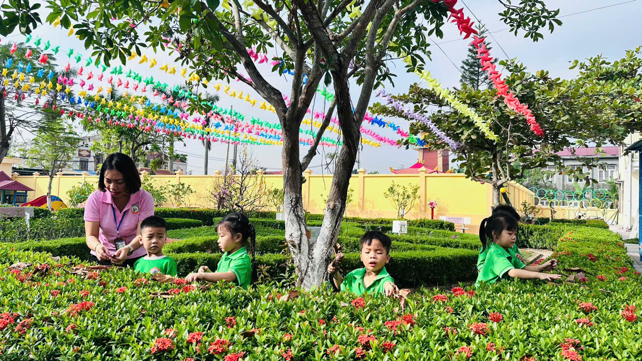 Ngoài ra để thúc đẩy việc học qua chơi ngoài việc sử dụng đồ chơi được trang bị, nhà trường, tập thể cán bộ giáo viên trong trường luôn tích cực phối hợp với cha mẹ học sinh để xây dựng cải tạo môi trường, trồng cây, các loại hoa, cây cảnh, xây dựng các khu vực chơi như chợ quê, khu vui chơi vận động, bé với sách, vườn rau của bé... , tự chế ra những đồ chơi mới từ vật dụng bỏ đi như lon sữa, chai lọ, ống hút…để làm đa dạng và phong phú thêm môi trường hoạt động ngoài trời cho trẻ, để trẻ có cơ hội được khám phá, trải nghiệm khi tham gia vào hoạt động.