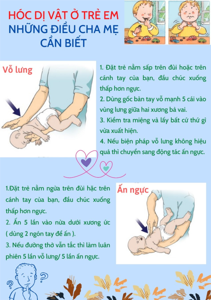 - Các bậc cha mẹ và giáo viên khi chăm sóc trẻ, cần nắm vững cách phòng tránh hóc sặc và có một số kĩ năng đơn giản, để giúp trẻ loại bỏ dị vật đường thở ra ngoài.