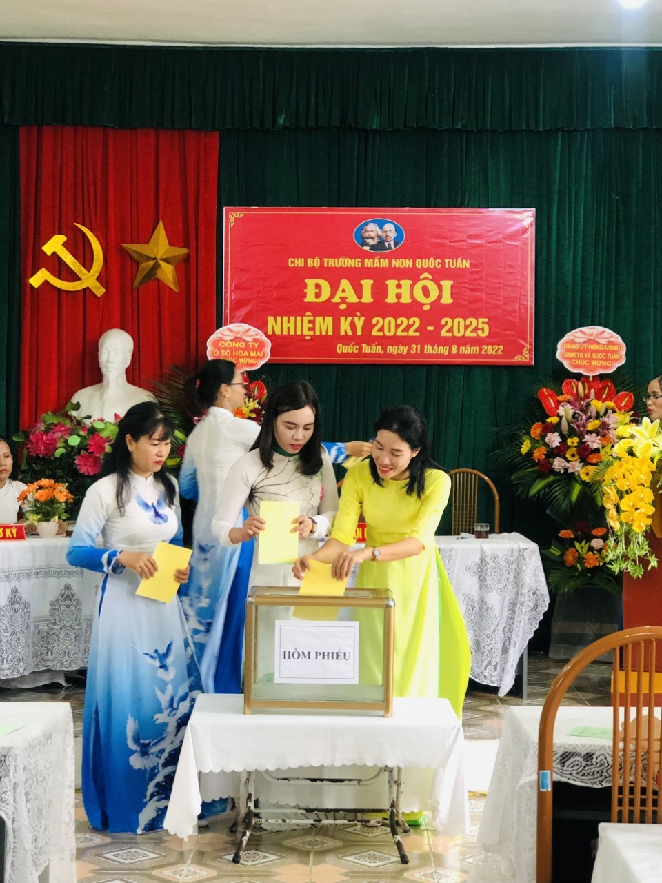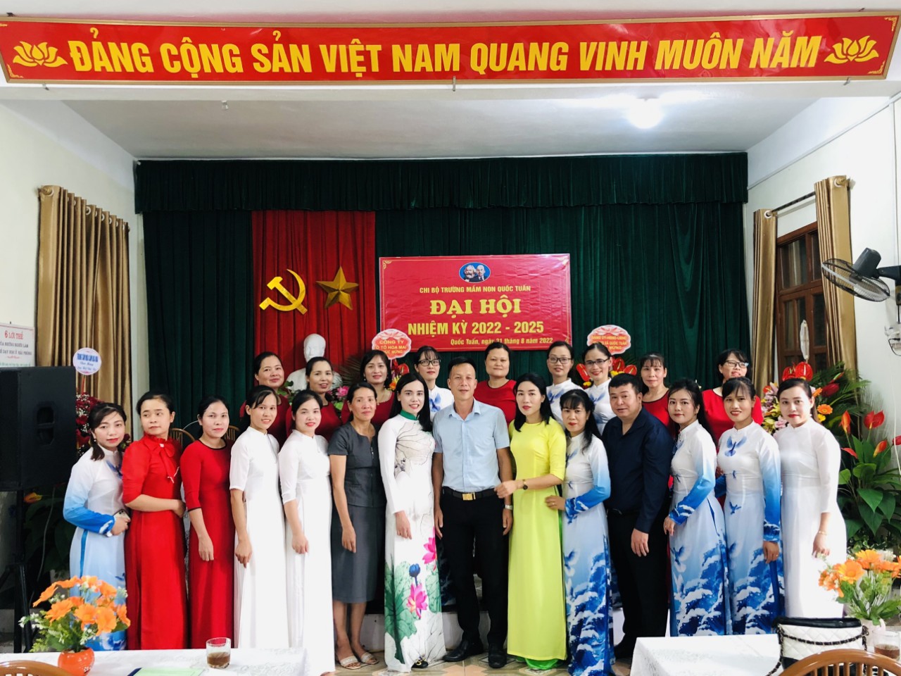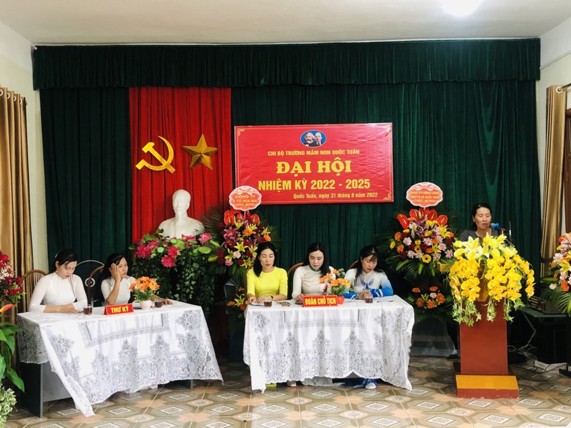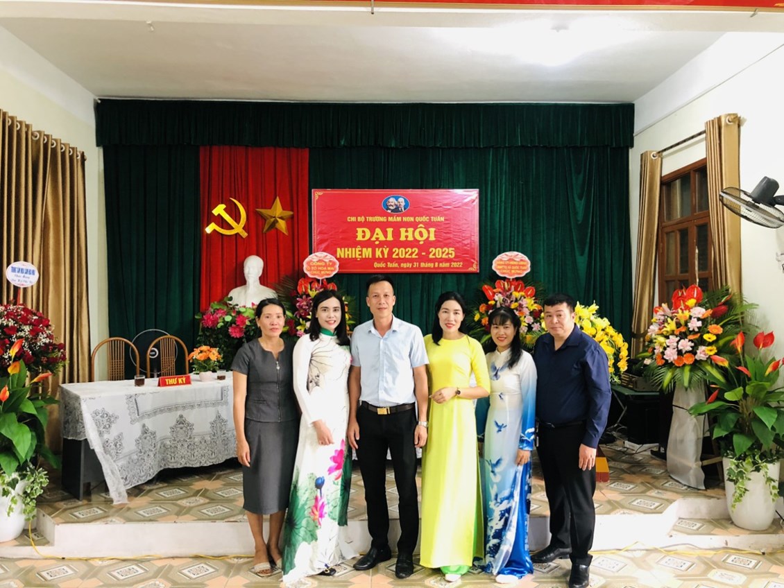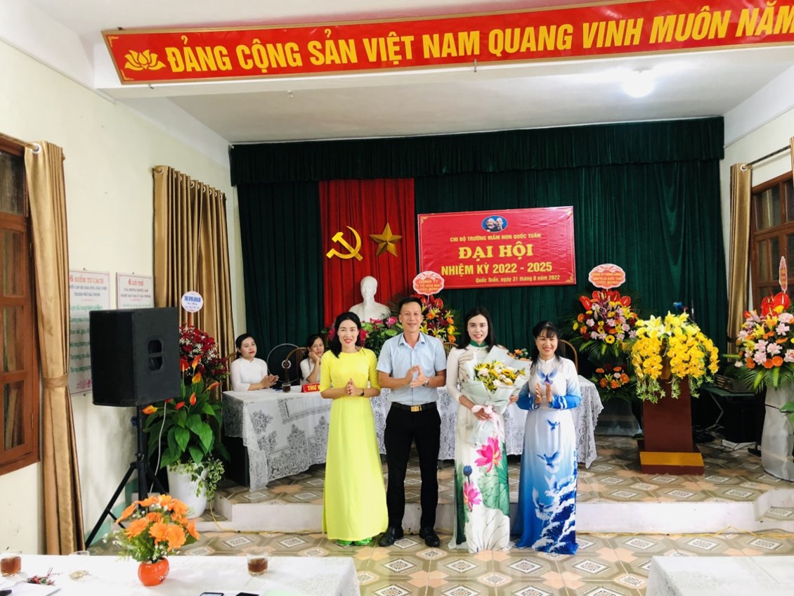 Chiều ngày 31/8/2022 Chi bộ trường Mầm non Quốc Tuấn đã tổ chức thành công Đại hội chi bộ nhiệm kỳ 2022-2025. đến dự và chúc mừng Đại hội có đ/c Trần Văn Huấn_ Bí thư đảng ủy- CTHĐND xã, đ/c Vũ Thị Dung_ Phó Bí thư đảng ủy xã cùng với đ/c đại diện cho công ty dịch vụ mua sắm Hoa Mai. Thay mặt chi bộ nhà trường đ/c Lê Thị Cúc_ Bí thư chi bộ- Hiệu trưởng nhà trường xin nhận những lãng hoa tươi thắm và chân thành cảm ơn những tình cảm và sự quan tâm của các đ/c lãnh đạo địa phương và các công ty đã đến dự và chúc mừng đại hội chi bộ trường MN Quốc Tuấn.