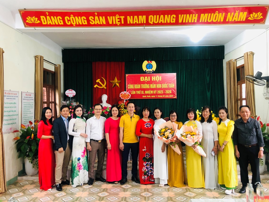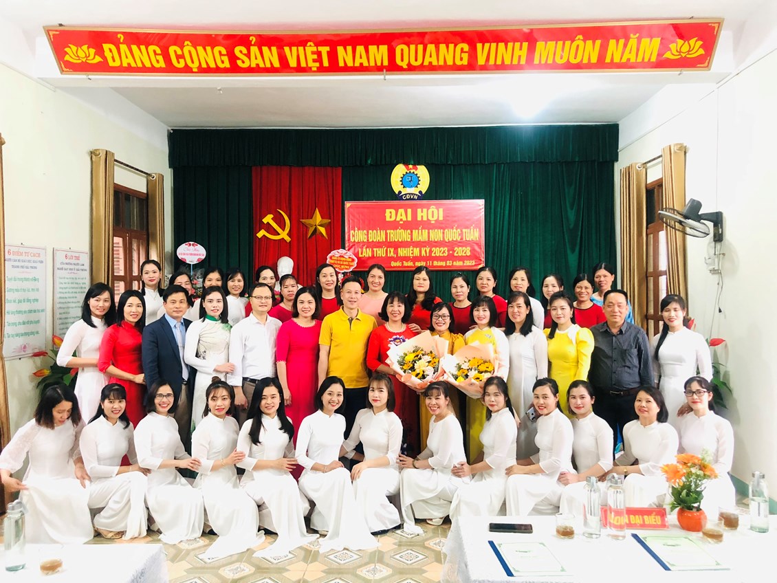 Công đoàn cơ sở trường mầm non Quốc Tuấn hiện có 42 đoàn viên. Nhiệm kỳ qua, Ban Chấp hành CĐCS trường mầm non Quốc Tuấn đã thực hiện tốt vai trò, chức năng của tổ chức công đoàn, đã đoàn kết, tổ chức tập hợp, giáo dục, động viên đoàn viên, viên chức, NLĐ phát huy truyền thống đoàn kết, phấn đấu thi đua hoàn thành thắng lợi các nhiệm vụ chính trị của địa phương, đơn vị, góp phần đẩy mạnh phong trào CNVCLĐ, hoạt động công đoàn của huyện và sự phát triển kinh tế – xã hội chung của huyện. Trong quá trình triển khai thực hiện chức năng, nhiệm vụ của tổ chức Công đoàn, Ban chấp hành CĐCS đã bám sát vào Nghị quyết Đại hội Đảng các cấp, Nghị quyết của chi bộ, Nghị quyết đại hội công đoàn các cấp, bám sát vào phương hướng, nhiệm vụ chính trị của địa phương, nhà trường và các chính sách pháp luật của Nhà nước có liên quan đến đoàn viên, CB viên chức. Toàn thể Đoàn viên luôn chấp hành tốt nội quy, quy chế làm việc của nhà trường, luôn hoàn thành tốt và hoàn thành xuất sắc nhiệm vụ chính trị được giao, CĐCS phối hợp với chuyên môn tổ chức cho đoàn viên, CBVC đi thăm quan, học tập kinh nghiệm, ngoài ra đoàn viên, CBVC luôn hưởng ứng tham gia vào các hoạt động xã hội từ thiện do MTTQ và các cấp, các ngành phát động, như đóng góp quỹ “đến ơn đáp nghĩa", quỹ vì người nghèo, quỹ bảo trợ trẻ em, quỹ “Mái ấm Công đoàn”, quỹ hỗ trợ phòng chống Covid- 19,...Các phong trào thi đua yêu nước được đẩy mạnh, trọng tâm là phong trào thi đua “Lao động giỏi”, “Lao động sáng tạo”, thi đua phục vụ sự nghiệp CNH, HĐH nông nghiệp và phát triển nông thôn, phong trào xây dựng nông thôn mới. Phong trào thi đua học tập nâng cao trình độ được cán bộ, đoàn viên tích cực thực hiện. Trong nhiệm kỳ, đã có 32 lượt đoàn viên có sáng kiến kinh nghiệm được công nhận cấp trường, 7 sáng kiến kinh nghiệm cấp huyện, đều được áp dụng vào thực tiễn mang lại hiệu quả trong giảng dạy và học tập ;