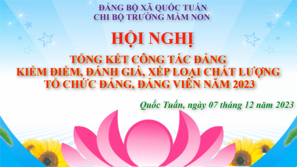 Thực hiện công văn số 1172 -CV/HU ngày 29/11/2023 của Ban Thường vụ Huyện ủy về việc Kiểm điểm và đánh giá, xếp loại tập thể, cá nhân năm 2023. Chiều ngày 07/12/2023 tập thể chi bộ trường mầm non Quốc Tuấn đã tổ chức Hội nghị “Tổng kết công tác Đảng, kiểm điểm, đánh giá, xếp loại chất lượng tổ chức Đảng, Đảng viên năm 2023” nhằm thực hiện công tác kiểm điểm, đánh giá, xếp loại chất lượng tổ chức cơ sở Đảng, Đảng viên năm 2023. Trên tinh thần dân chủ, khách quan nhìn thẳng vào sự thật để đánh giá những ưu điểm để phát huy và chỉ ra những mặt hạn chế khuyết điểm để khắc phục sửa chữa làm trong sạch tổ chức đảng để mỗi cá nhân Đảng viên và tập thể chi bộ ngày càng trong sạch vững mạnh.
