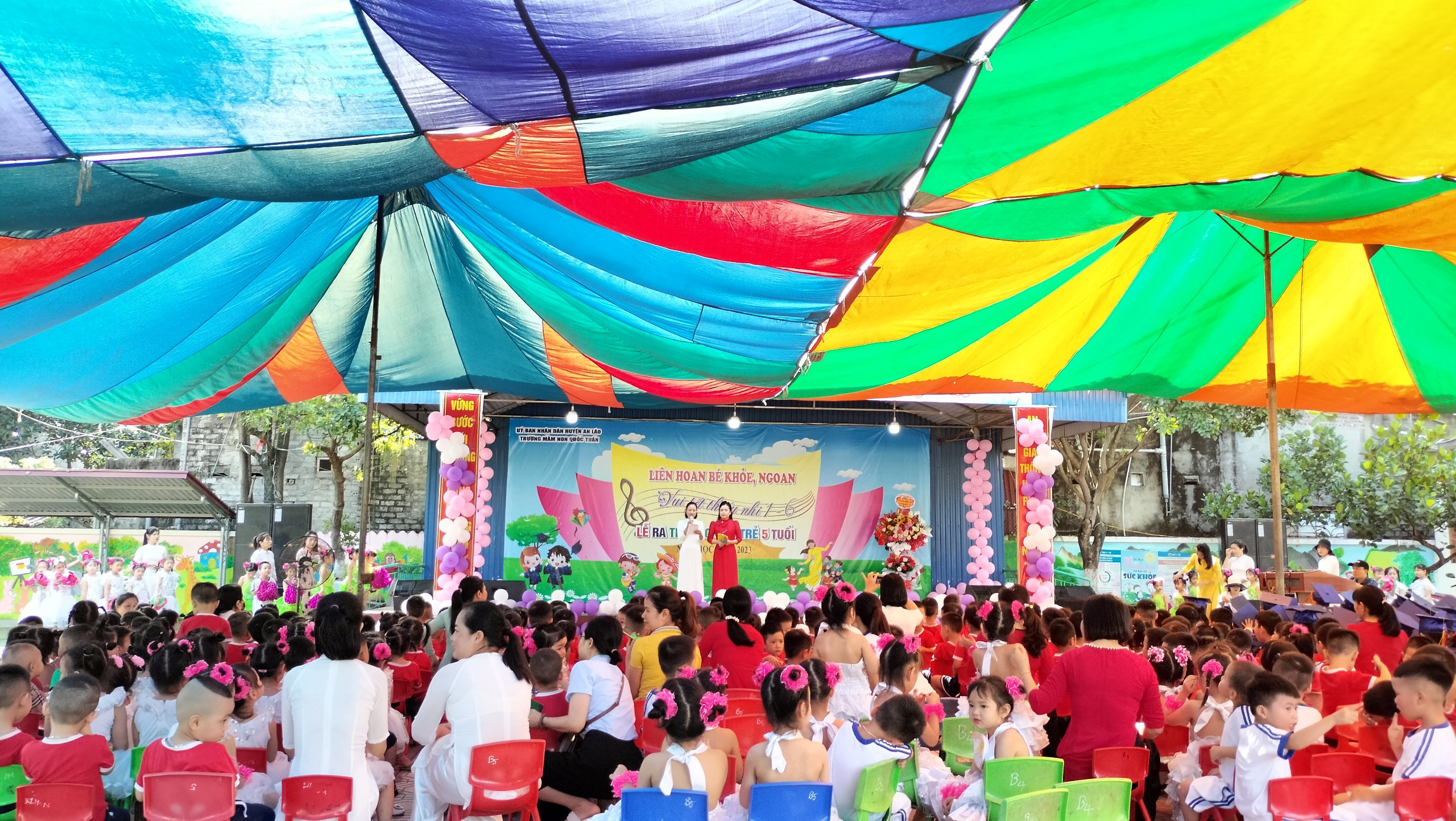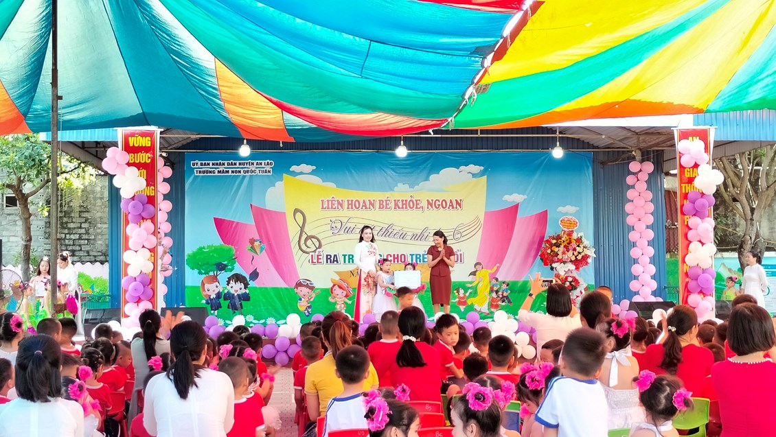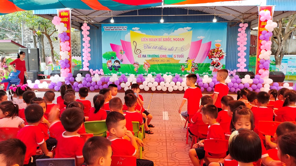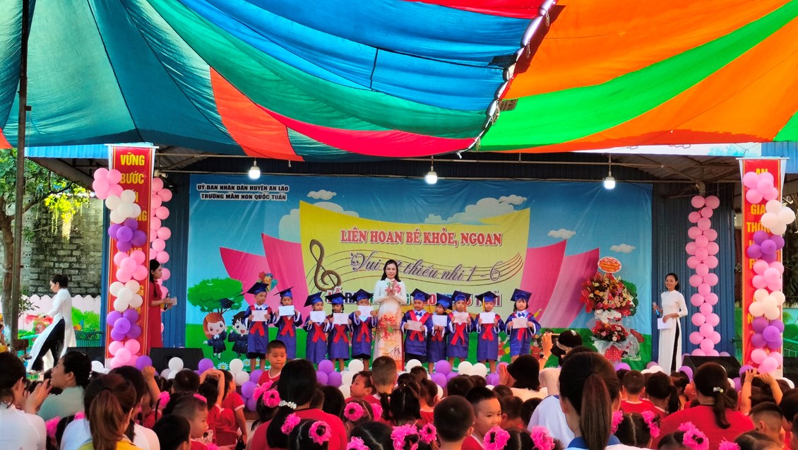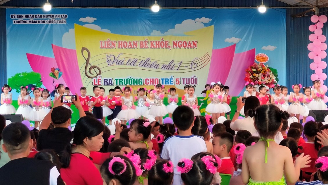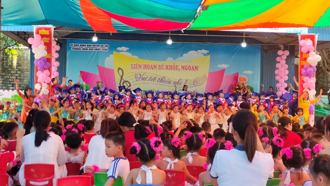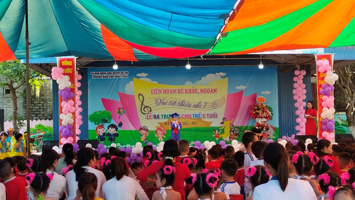 Ngày 30/5/2023 trường MN Quốc Tuấn đã tổ chức thành công buổi liên hoan bé khỏe, ngoan, vui tết thiếu nhi 1/6 và lễ ra trường cho trẻ 5 tuổi. Về dự với buổi liên hoan nhà trường vinh dự được đón tiếp đ/c Vũ Thị Dung - Phó bí thư đảng ủy xã cùng các đ/c lãnh đạo xã Quốc Tuấn. Đặc biệt là sự có mặt của đông đảo quý phụ huynh cùng hơn 400cháu đã góp phần tại nên sự thành công của buổi lễ liên hoan ngày hôm nay. Thay mặt BGH và các cô giáo trường MN Quốc Tuấn đ/c Lê Thị Cúc- HT nhà trường đã phát buổi bày tỏ cảm xúc trước sự quan tâm của các cấp lãnh đạo và quý phụ huynh. Nhà trường sẽ tiếp tục phát huy những thành tích đã đạt đc và sẽ cố gắng đưa trường MN Quốc Tuấn ngày càng phát triển hơn nữa. Cuối cùng cô HT chúc các bé 5 tuổi ra trường có sức khỏe tốt, luôn nghe lời ông bà, cha mẹ, có 1 kỳ nghỉ hè ý nghĩa và tự tin bước vào cấp học mới! Chúc các bé lớp NT, 3T, 4T khỏe mạnh, chăm ngoan có 1 kỳ nghỉ hè vui vẻ và an toàn.