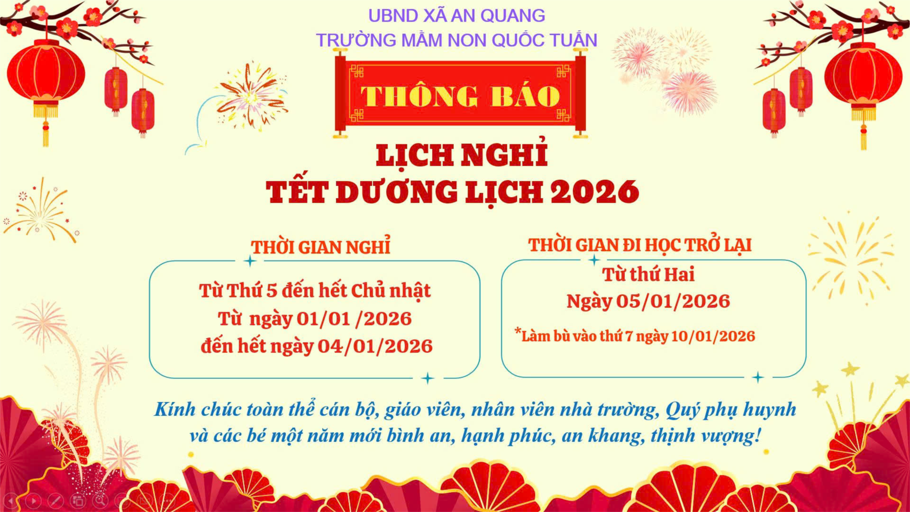 Trường Mầm non Quốc Tuấn trân trọng thông báo đến toàn thể CB, GV, NV nhà trường, Quý phụ huynh và các con lịch nghỉ Tết Dương lịch 2026 như sau: