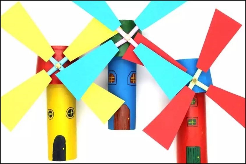 - Dùng keo nến dán các miếng giấy vừa cắt lên từng chiếc ống hút nhỏ, phần còn lại của tờ giấy uốn cong để tạo cánh quạt gió. Thực hiện tương tự với 3 chiếc ống hút còn lại.